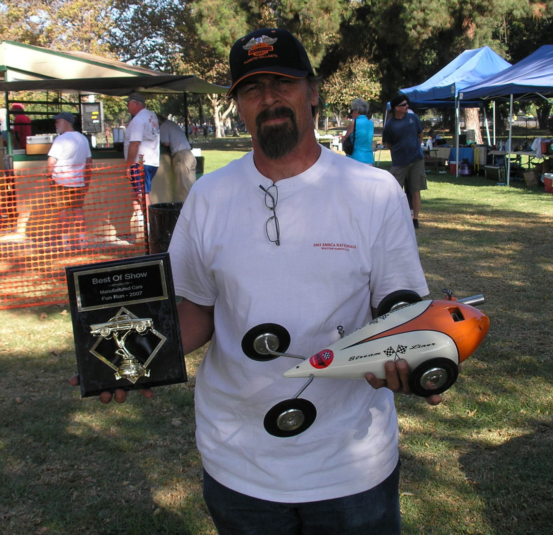 Chuck Larkin wins for Best Manufactured Car with his McCoy Streamliner in the “Tether Car Show” organized by Bob Jaquez as part of the Fun Run Swap Meet which was held with AMRCA Nationals this year at Whittier Narrows. Congratulations, Chuck!!!!
